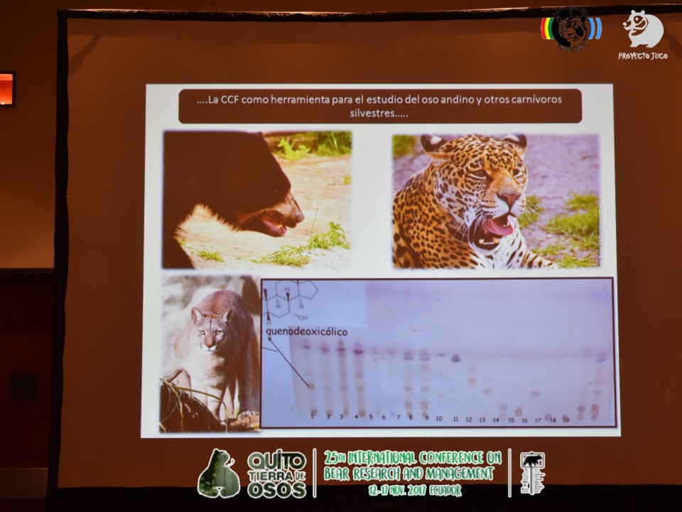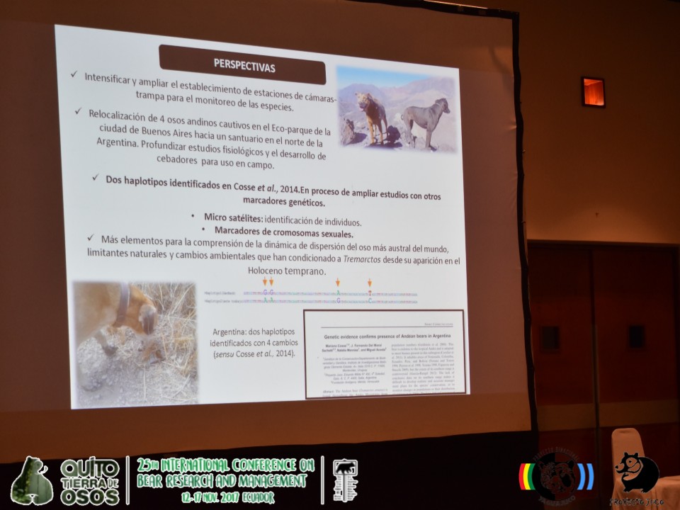 Respecto a la Argentina, el país, estuvo representado por dos investigadores del Proyecto Juco. Los avances en la investigación y la conservación de los osos en el área más austral donde el grupo habita a nivel global, fueron presentados oralmente, previa evaluación del Comité Científico de la Conferencia. Proyecto Juco ha intervenido el día martes 14 de noviembre, con dos ponencias. La primera exposición titulada: «Hacia el sur:el oso más austral del mundo, en un ambiente de contrastes«; trató sobre la historia evolutiva del género, su dispersión y los cambios ambientales a los cuales se ha adaptado Tremarctos desde sus orígenes. En tiempo presente, nuestra investigación sugiere un uso estacional del hábitat por parte de Tremarctos ornatus, influenciado más por la disponibilidad de recursos alimentarios específicos y la presencia de agua y no así; por la limitante que se hipotetizó podría generar la ocurrencia de otros grandes carnívoros como el jaguar (inclusive por arriba de los 3.000 m.s.n.m., en nuestro trabajo) en el extremo sur de la distribución del oso. Mostrando así, que los osos están actualmente dispersándose en algunos sitios puntuales. Respondiendo presumiblemente a los cambios ambientales, como de la misma forma están respondiendo otros grandes carnívoros, como el jaguar usando frecuentemente como corredor las áreas de roquedales y crestas montañosas, en coexistencia con el puma en las tierras altas o los zorros del género Lycalopex en esta área en particular.