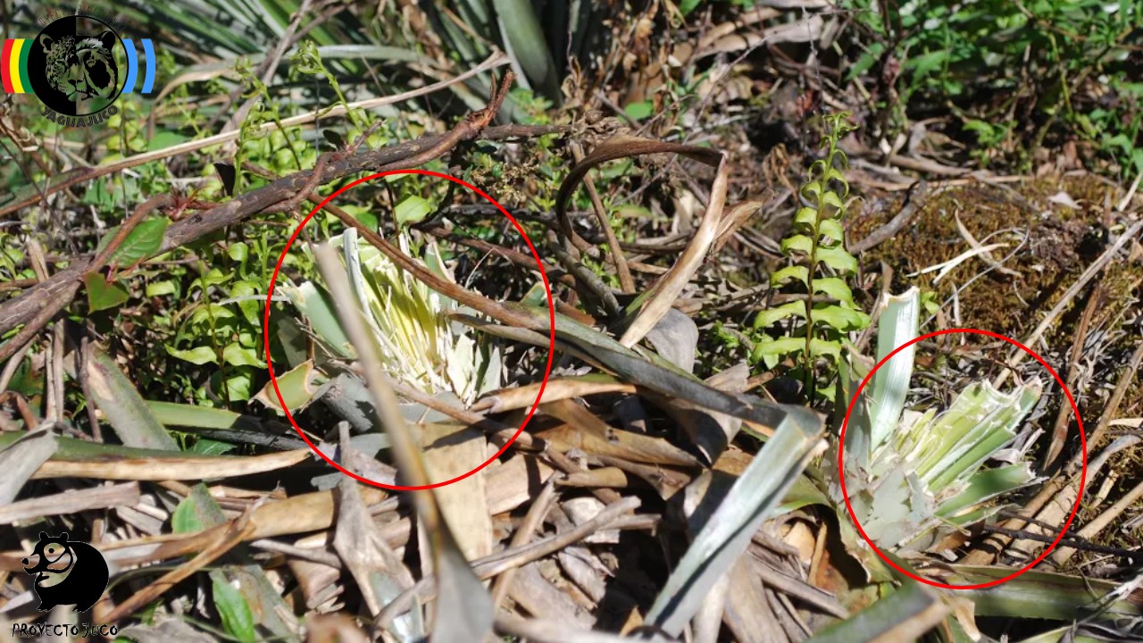 Taracas (Puya novarae) consumidas por oso andino en un área abierta de pastizal y cañada.